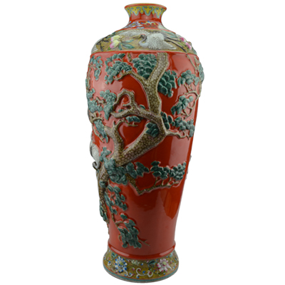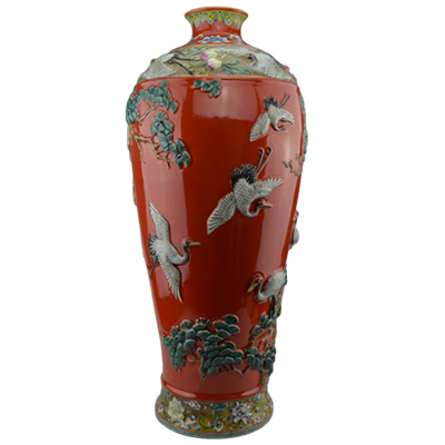 名稱:礬紅釉高浮雕松鶴延年紋梅瓶655-2