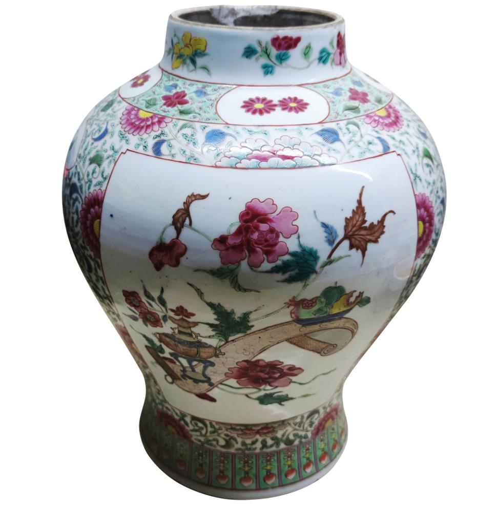 名稱:粉彩開光花卉將軍罐(罐口及瓶身有裂紋)