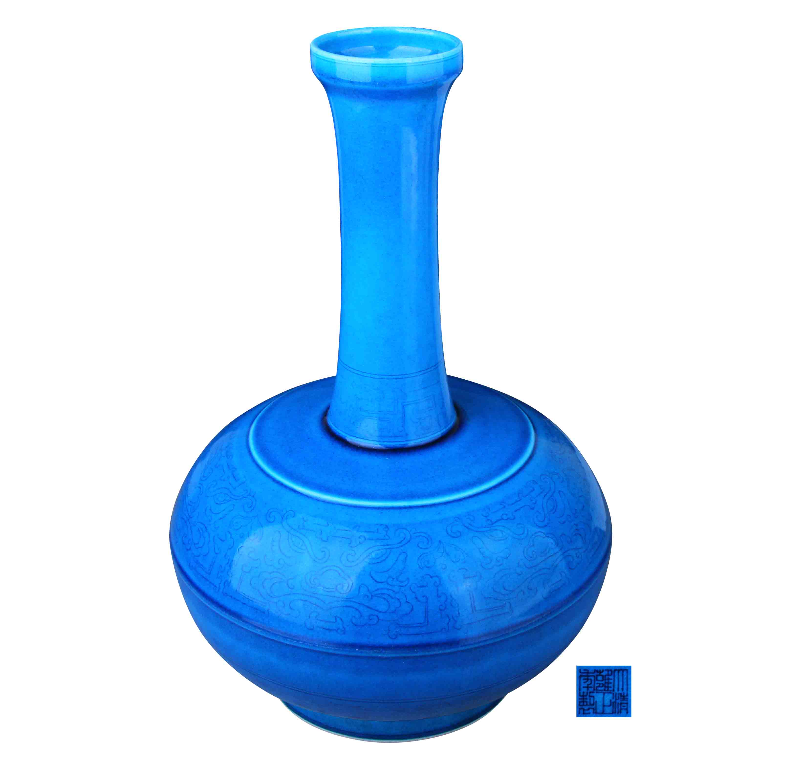 名稱:大清雍正年制款天藍釉暗刻龍紋長頸瓶