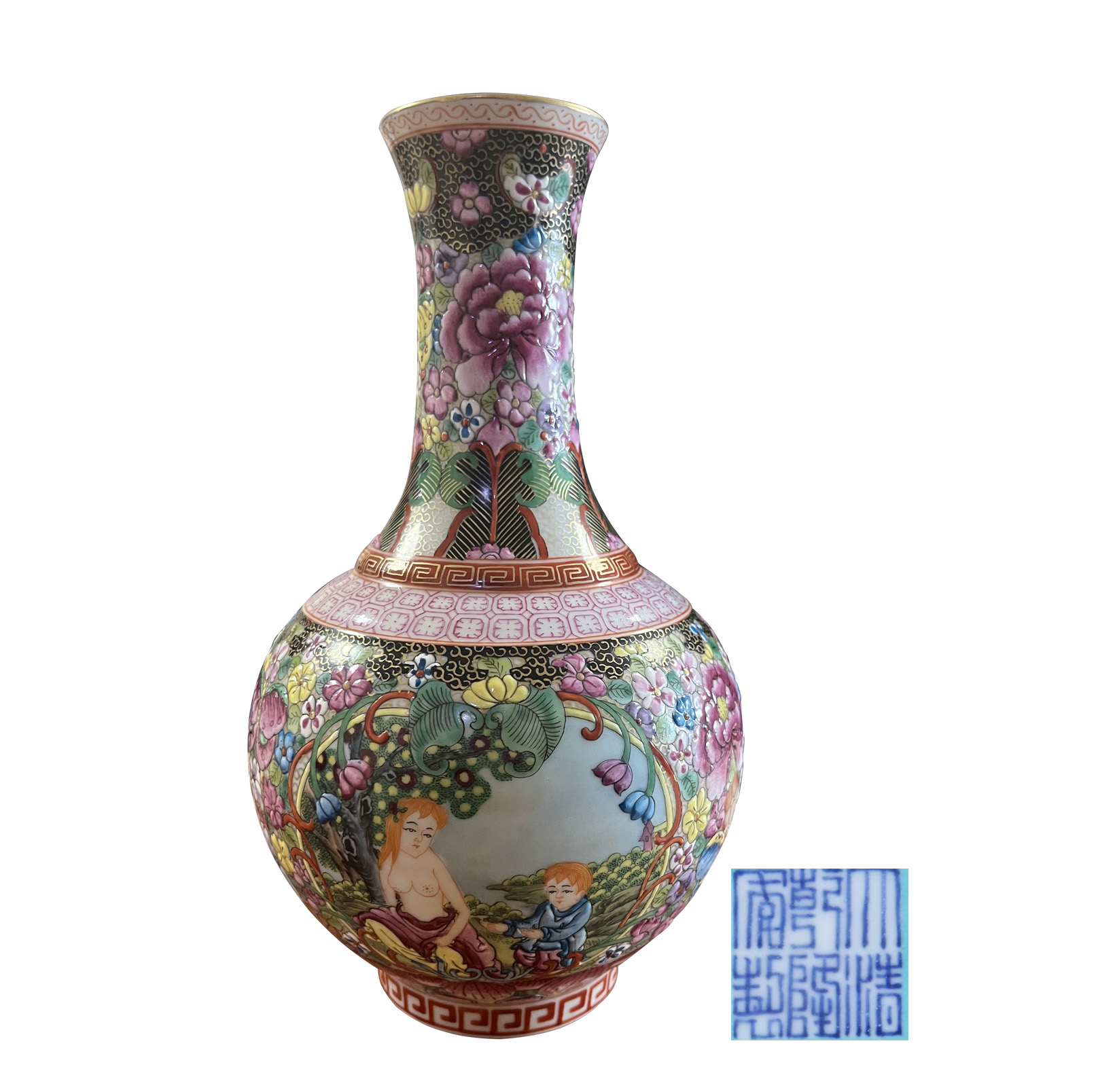 名稱:大清乾隆年制款琺瑯彩百花不露地雙開窗母子平安賞瓶