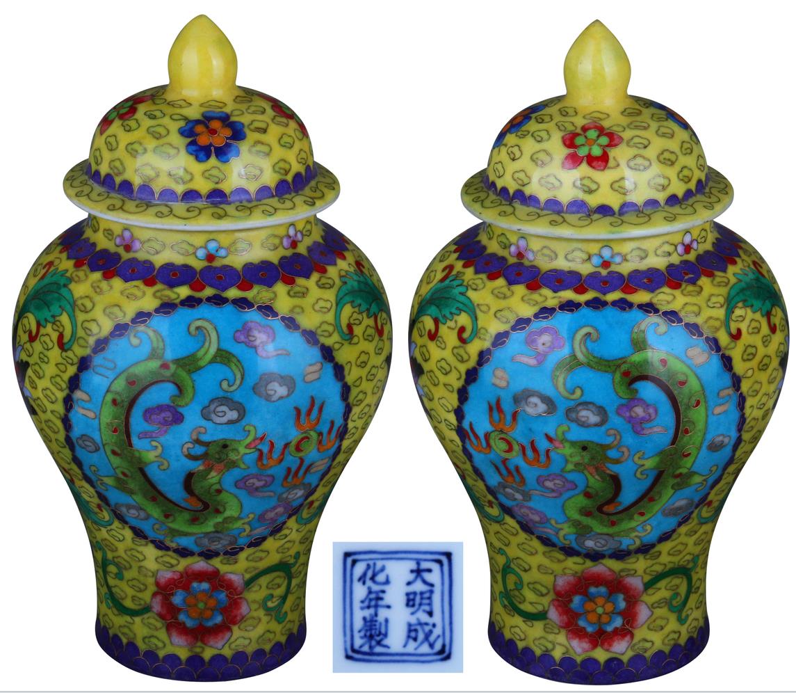 名稱:大明成化年制款掐絲琺瑯彩將軍罐一對