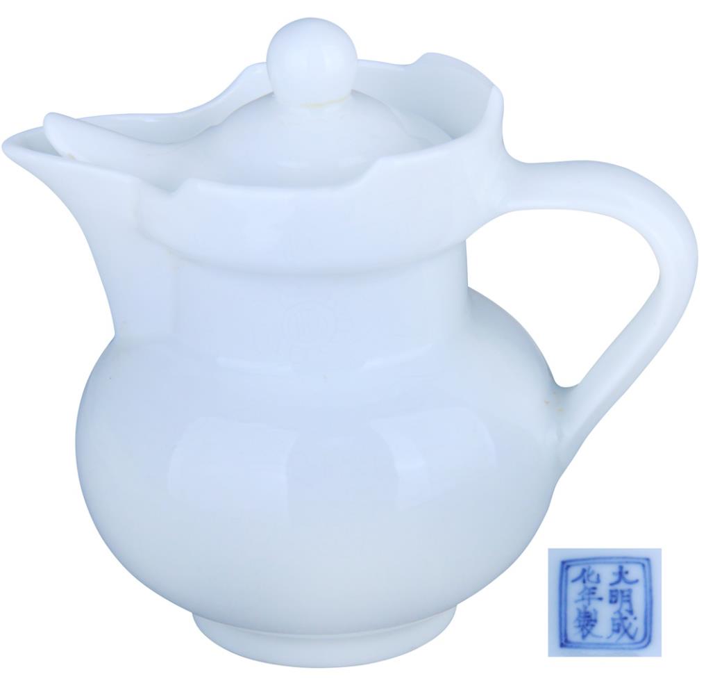 名稱:大明成化甜白釉喑刻龍鳳僧帽壺
