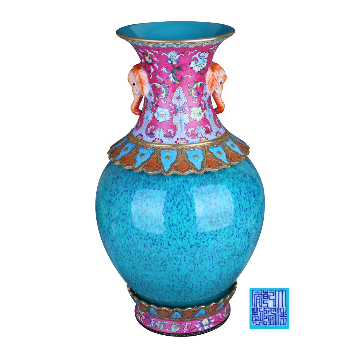 名稱:大清乾隆年制款胭脂紅軋道錦地洋彩纏枝花卉套爐鈞釉象耳轉心瓶
