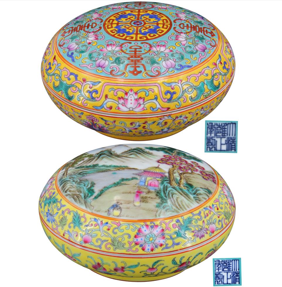 名稱:大清雍正年制黃地粉彩壽字捧盒一對