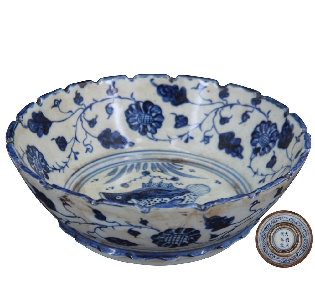 名稱:大明成化年制款青花魚藻紋葵口賞盤