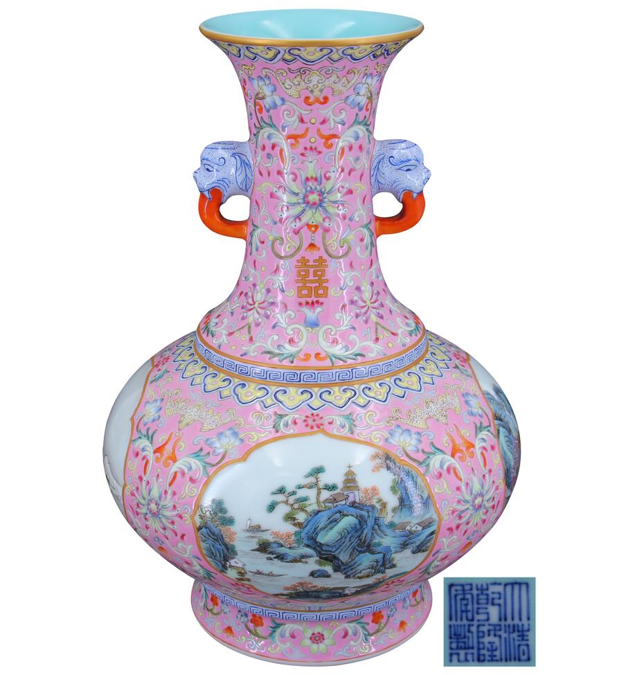 名稱:大清乾隆年制款粉彩花卉開光雙耳賞瓶