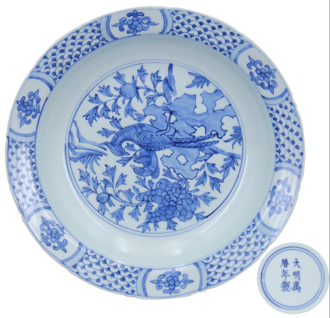名稱:大明萬歷年制款青花花鳥紋葵口賞盤
