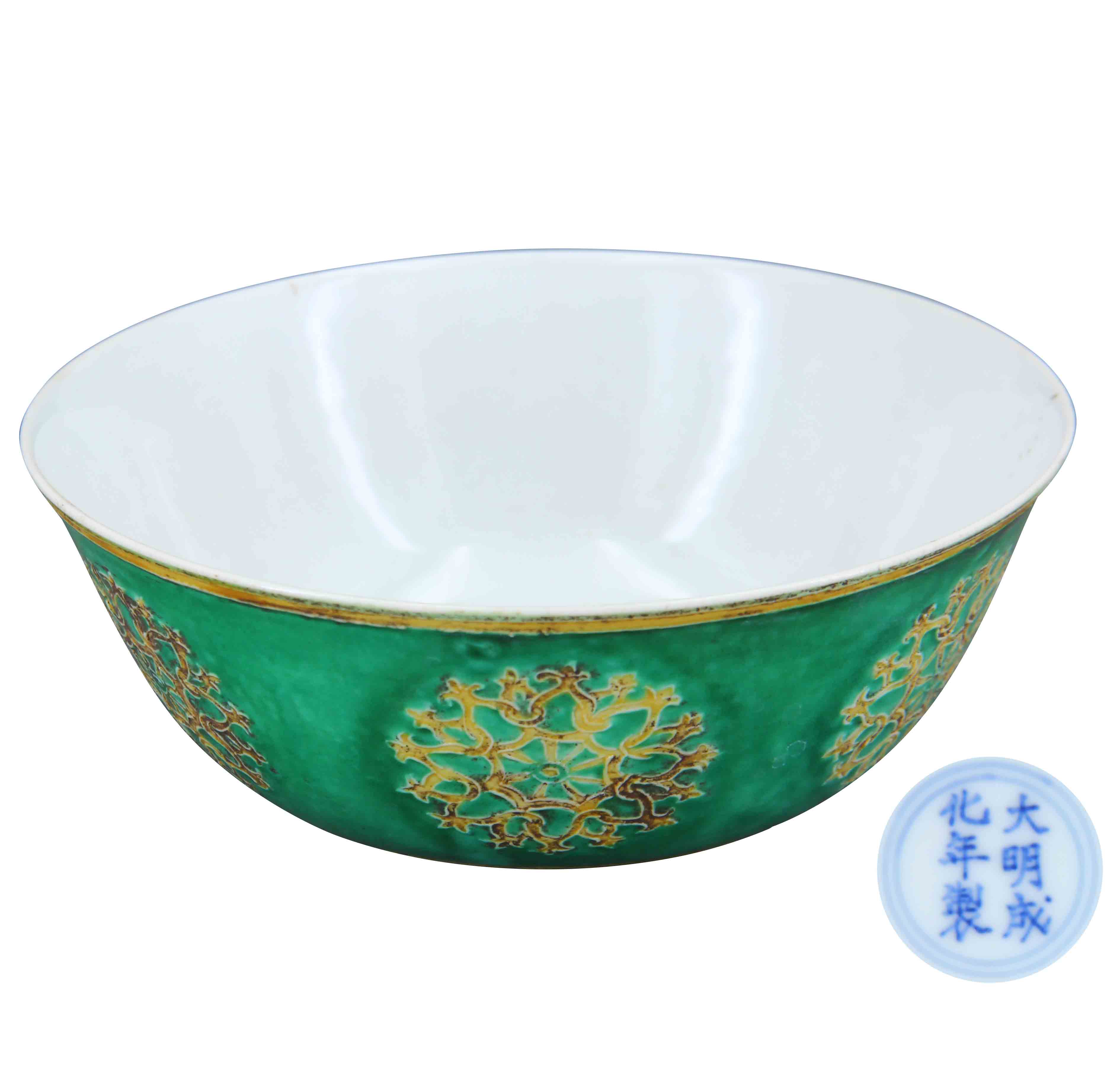 名稱:大明成化年制刻花綠釉團(tuán)花臥足碗