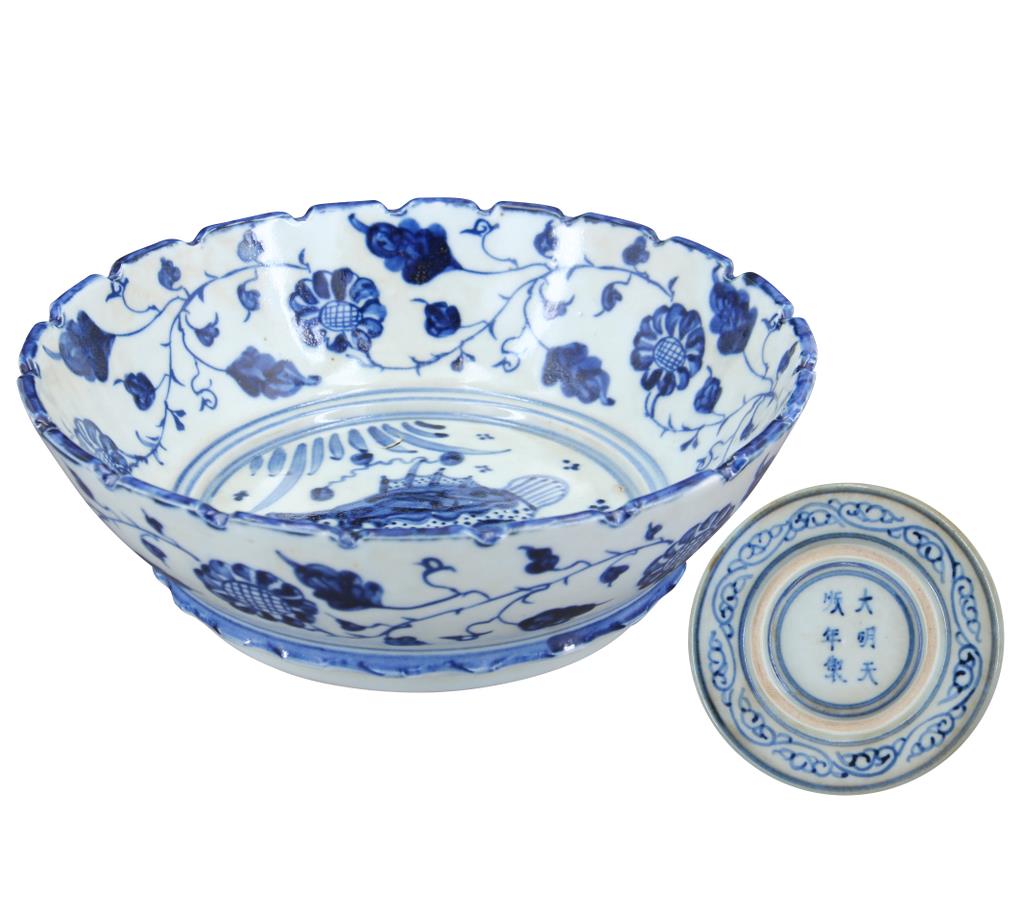 名稱:大明天順年制款青花魚藻紋花口盤