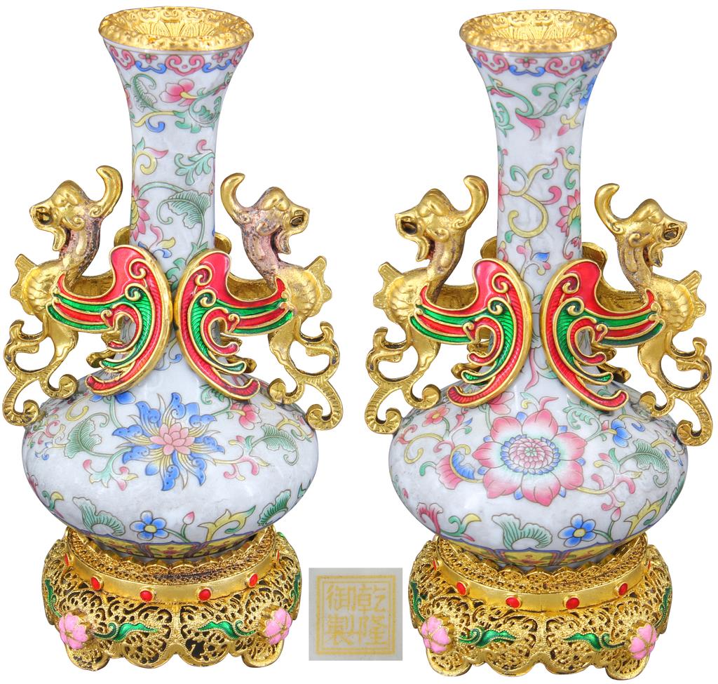 名稱:乾隆御制款粉彩包金雙螭耳賞瓶一對
