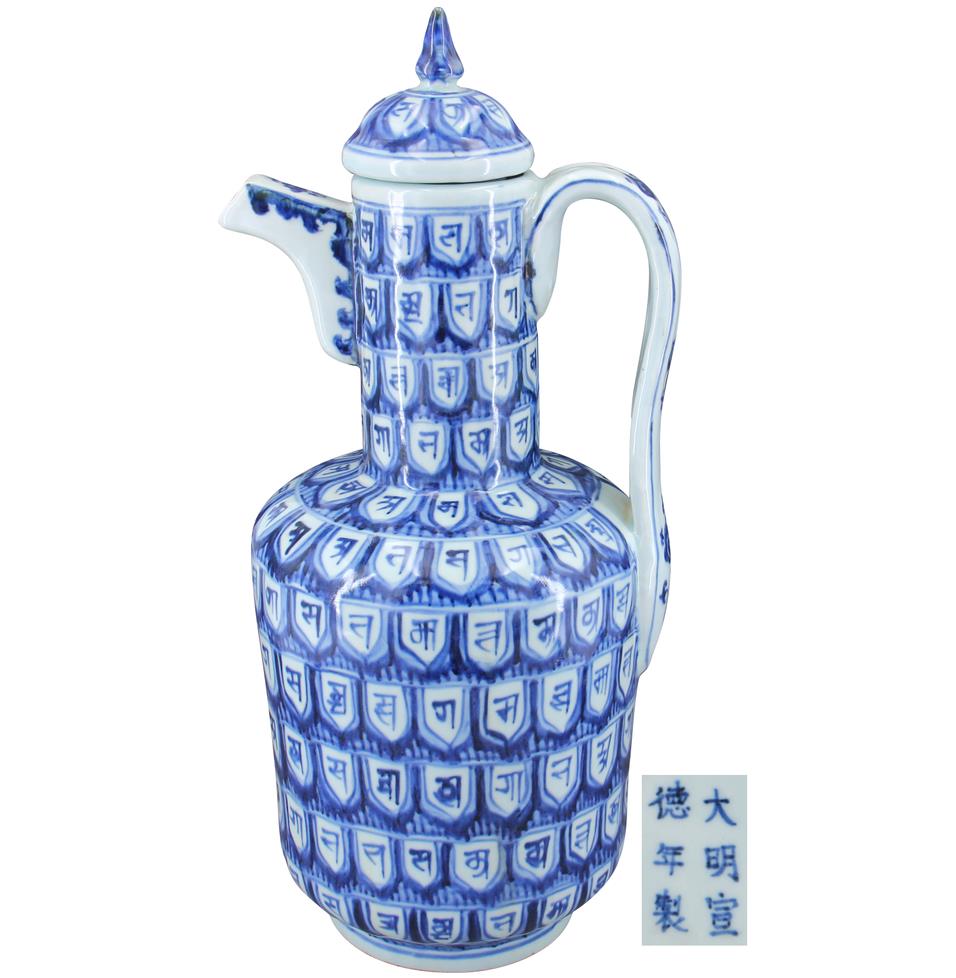 大明宣德年制青花梵文方流直頸執(zhí)壺,為御用執(zhí)壺中的精品,釉質(zhì)肥厚、寶光四溢,不僅釉色自然、均勻,器型線條雍容典雅,秀美多姿、而且層次感豐富,青花發(fā)色純凈,腹上通體梵文,梵文是佛經(jīng)深入社會的體現(xiàn),紋飾繁而不亂,具有極強的藝術(shù)感染力,瓷器上梵文的使用,宣德時期存世到今特別稀少,老味十足、頗為難得,值得投資收藏……