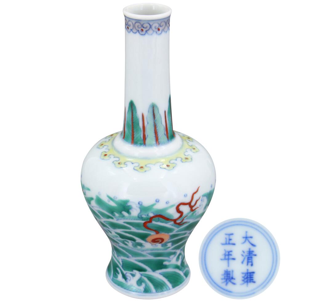大清雍正年制款--斗彩海水瑞獸搖鈴尊,此器小口、細(xì)長(zhǎng)頸、溜肩、鼓腹而漸漸垂下內(nèi)收, 造型俊秀而雅、小巧玲瓏,比例協(xié)調(diào),胎體細(xì)膩光潤(rùn)、薄而輕,制作精良,釉色潔白勻凈、釉層薄而均勻,器身斗彩瑞獸紋顏色各異,形象逼真、質(zhì)感生動(dòng),整體設(shè)色、布局、畫意均無(wú)可挑剔,充分表現(xiàn)了皇室雍容華貴御用之物,搖鈴尊存世稀少而又是獨(dú)特的品類,器型少有罕見,可為匠心獨(dú)具,使其藏家備受關(guān)住……