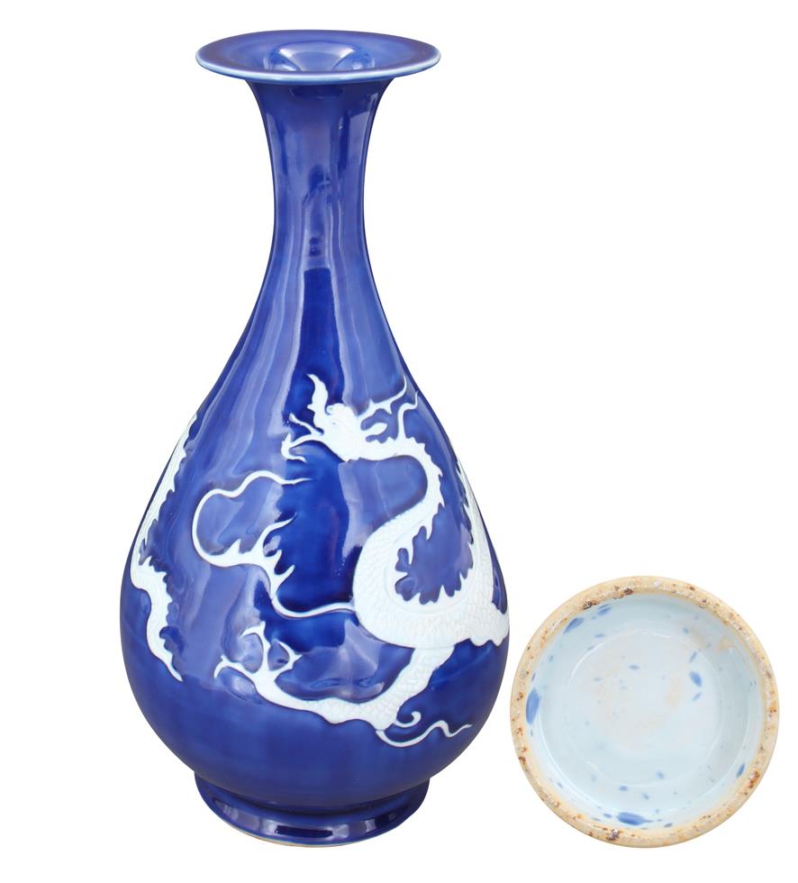 霽藍(lán)釉留白龍紋玉壺春瓶--玉壺春瓶是一件瓷器類別當(dāng)中的珍品之一,以其獨(dú)特的造型、華麗的釉色和精美的紋飾而備受矚目,瓶身整體造型線條流暢、柔和自然,中部留白形成一道優(yōu)雅的弧線恰到好處,使得整個(gè)瓶子看來更加生動(dòng),突出了瓶身主體部分,增強(qiáng)了整體的藝術(shù)效果,龍紋形象栩栩如生、飄逸靈動(dòng),給人強(qiáng)烈的視覺享受,通過這件作品可以感受到古代匠人的獨(dú)特審美和精湛技藝,無論是在欣賞、收藏還是研究方面,都是一件不可多得的珍貴藝術(shù)品!
