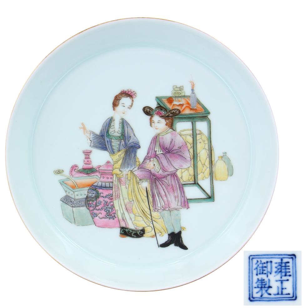 此件雍正御制款·西洋人物賞盤,是清代宮廷御用的珍貴瓷器。此件賞盤通常以琺瑯彩繪制,畫面多描繪西洋人物和博古紋,展現(xiàn)了中西文化融合的獨特魅力。其制作工藝精湛,繪畫細膩,色彩豐富,尤其是底部落款“雍正御制”,極為周正。另外胎質非常細膩,釉面光滑,呈現(xiàn)出一種溫潤的質感。并且底胎上來講有明顯的塌陷,證明純手工拉坯與燒制之根源。胎質細膩無雜質,較為明顯的鴨蛋青,胎質堅硬。更是證明了皇家出身和獨特地位。另外重點采用琺瑯彩料設色作地采用油畫技法繪西洋人物以及博古紋畫面,色彩亮麗古雅,層次錯落分明。其工藝十分獨特,應為此時期的特殊器物,充分反映出雍正時期高超的制瓷工藝水平。