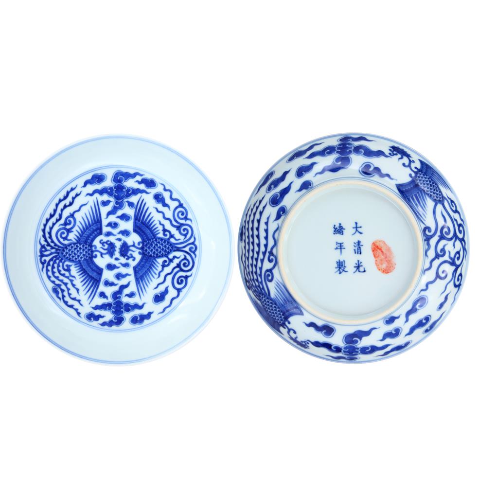 大清光緒年制款青花鳳紋祥云賞盤(pán),圖案設(shè)計(jì)精美,盤(pán)內(nèi)心繪有鳳紋,外壁則以比翼穿云的飛鳳紋為主要裝飾,象征著吉祥和幸福。以及自己的理想、抱負(fù)表達(dá)之感。器型以及紋飾上為:敞口,淺弧腹,圈足,器形規(guī)整。釉質(zhì)細(xì)膩溫潤(rùn),器形織巧,白釉泛青,青花色澤青翠,盤(pán)心及外壁以青花繪雙鳳紋飾,附以祥云紋飾,紋飾流暢,構(gòu)圖緊湊,樣式優(yōu)美,此紋飾俗稱“對(duì)頭鳳”,是清代官窯瓷器的傳統(tǒng)圖案之一。器底書(shū)“大清光緒年制”六字雙行楷書(shū)款,排列整齊,字體工整。是清代光緒時(shí)期的瓷器佳作,具有較高的歷史和文化價(jià)值!