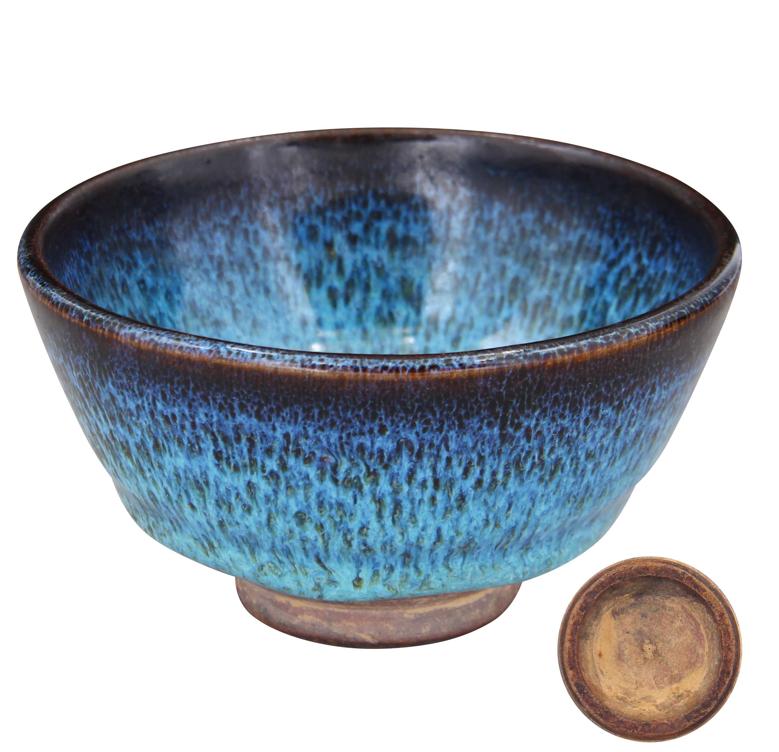 此件鈞窯窯變釉茶盞為元代作品,敞口,弧腹下收,底圈足,器形較為厚重。釉不及底。通體施月白釉,釉內(nèi)氣泡密集?谘赜悦媾c局部有自然的窯變玫瑰紫彩斑。釉汁瑩潤,胎質(zhì)密實(shí),塑造自然、規(guī)整,不失整體的美感,端莊肅穆,古樸雄渾,具有中西合壁濃厚文化色彩。為元代鈞窯瓷器中的上品。具有較高的收藏價(jià)值!