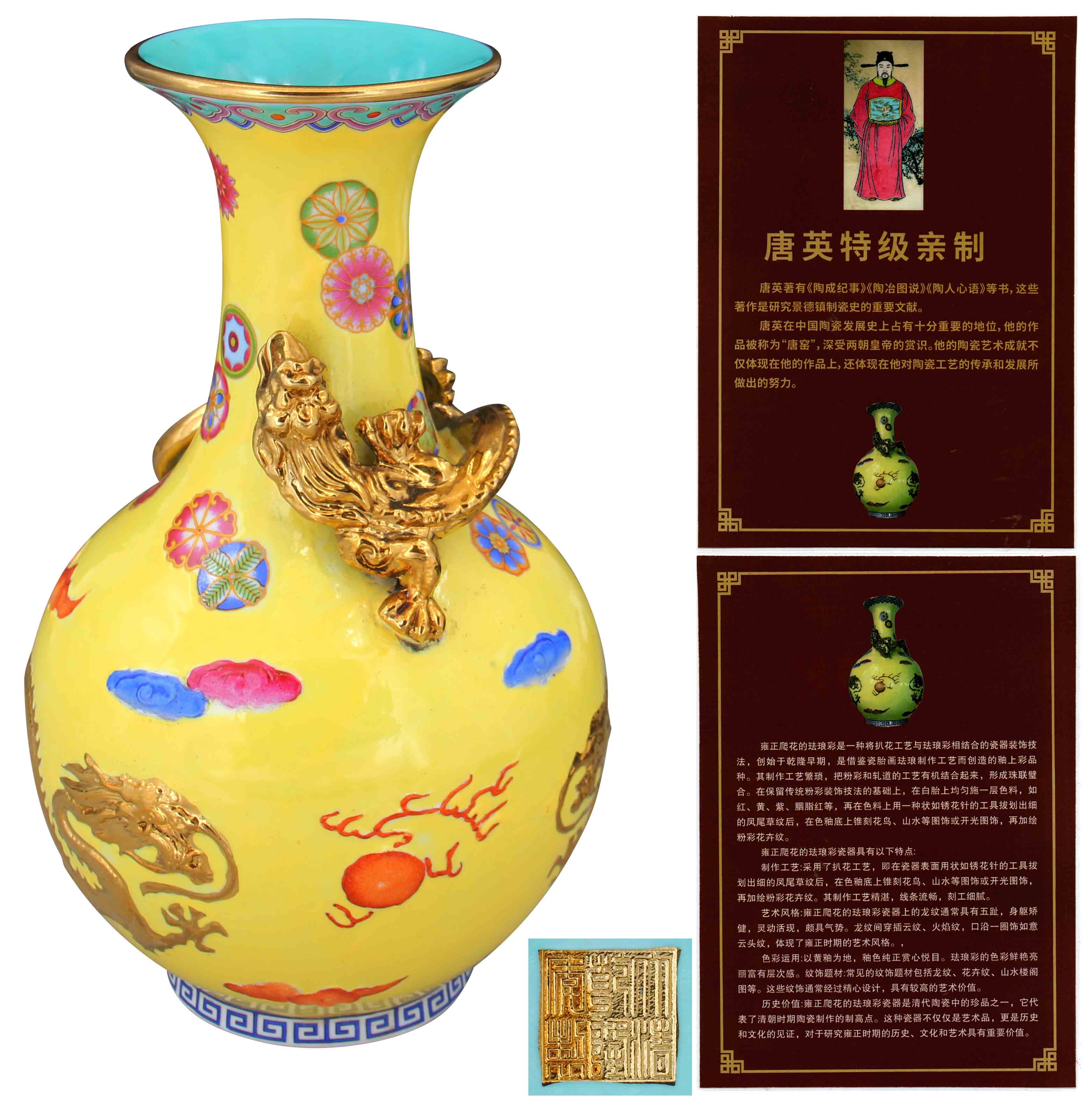 〈大清乾隆年制·黃地描金堆塑龍紋賞瓶〉藏品為乾隆時(shí)期經(jīng)典代表作之一,此賞瓶撇口、溜肩、圓腹,口沿描金、瓶外壁通體施黃釉,繪花卉描金龍紋裝飾,器形規(guī)范優(yōu)美、釉水溫潤(rùn)肥厚,胎質(zhì)細(xì)膩、畫面布局勻稱、色彩淡雅、富力多姿,肩部堆塑龍紋造型精美周正、氣勢(shì)磅礴神態(tài)逼真動(dòng)感十足,造型精良獨(dú)具匠心,整體紋飾搭配自然合理,集實(shí)用性與藝術(shù)性于一身,展現(xiàn)古代工匠智慧和藝術(shù)的結(jié)晶,無論是收藏價(jià)值還是歷史價(jià)值都比較受關(guān)注,值得入手收藏……