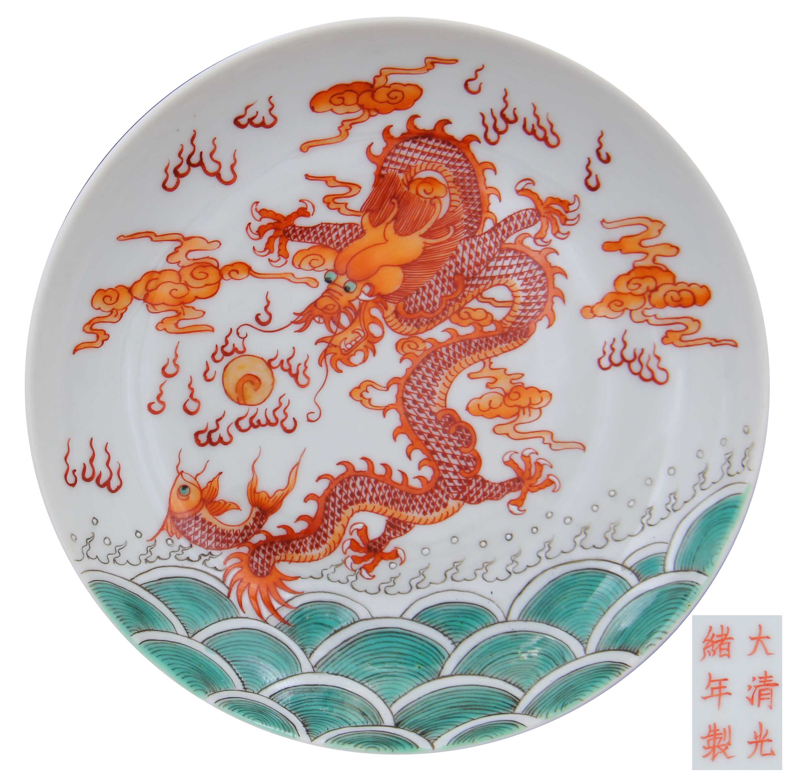 《大清光緒年制--礬紅海水龍紋賞碟》此器物造型規(guī)整,敞口、淺腹,整器通體施白釉,內(nèi)繪海水龍戲珠紋,造型大氣磅礴、畫工筆意瀟灑隨和,姿態(tài)矯健飄逸,礬紅施彩均勻、顏色艷麗、布局嚴(yán)謹(jǐn)、工藝精湛,線條分明更具有立體感,耀眼奪目、宮廷氣息濃郁,縱觀此器,彰顯皇家威嚴(yán),堪稱光緒御瓷之精品……