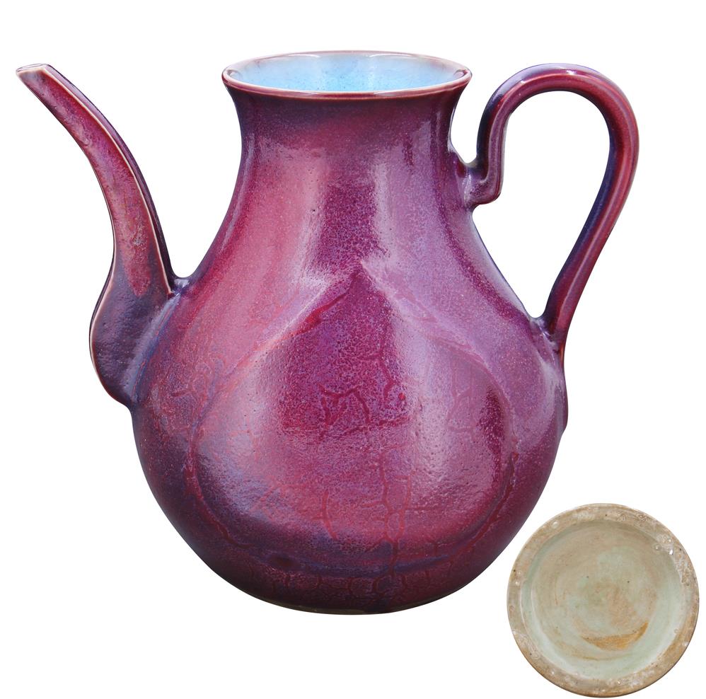 宋代仿古好尚,除了宗教禮器仿自上古青銅器之外,這一風(fēng)氣也影響到皇家日常用具。明習(xí)宋風(fēng),特別是永樂(lè)一朝,國(guó)力昌隆,仿古摹古之風(fēng)盛行,如景德鎮(zhèn)御窯廠遺址出土過(guò)明永樂(lè)甜白釉杏圓方流扁壺殘件,2 0 0 4年禹州鈞臺(tái)窯址也出土過(guò)類似的鈞窯方流杏圓扁壺殘件。本拍品,敞口、折沿、短頸、鼓腹、腹下微收、方流、杏圓扁腹,整器構(gòu)思巧妙,線條柔美,方中有圓,圓里藏方;底部施芝麻醬釉,且用細(xì)小支釘燒制,外施玫瑰紫釉,內(nèi)施天青,釉面滋潤(rùn)如酥,冰涼柔滑,光澤柔和,釉層里外影約蚯蚓走泥紋,胎色香灰,氣泡自然老化明顯,益見(jiàn)古拙之氣,極富凝重古樸之感,深得宋器之神韻。
