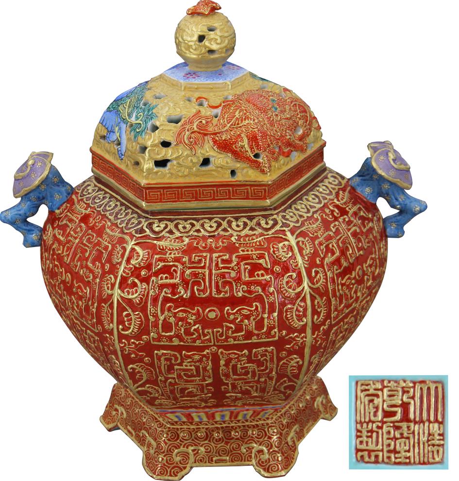 名稱:大清乾隆年制·六方珊瑚地描金饕餮紋雙耳熏爐