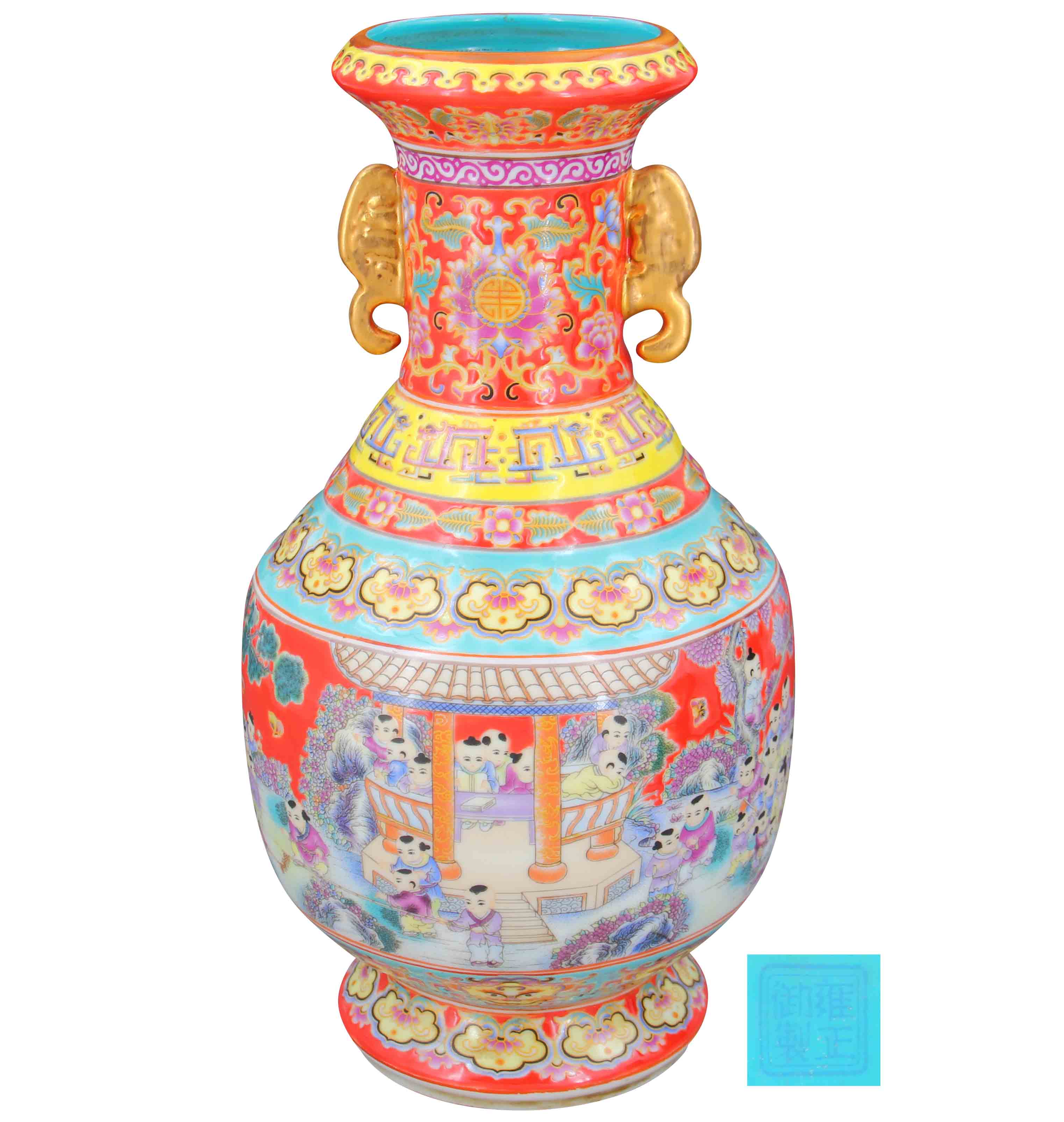 名稱:雍正御制粉彩百子圖雙螭耳鎏金盤口瓶