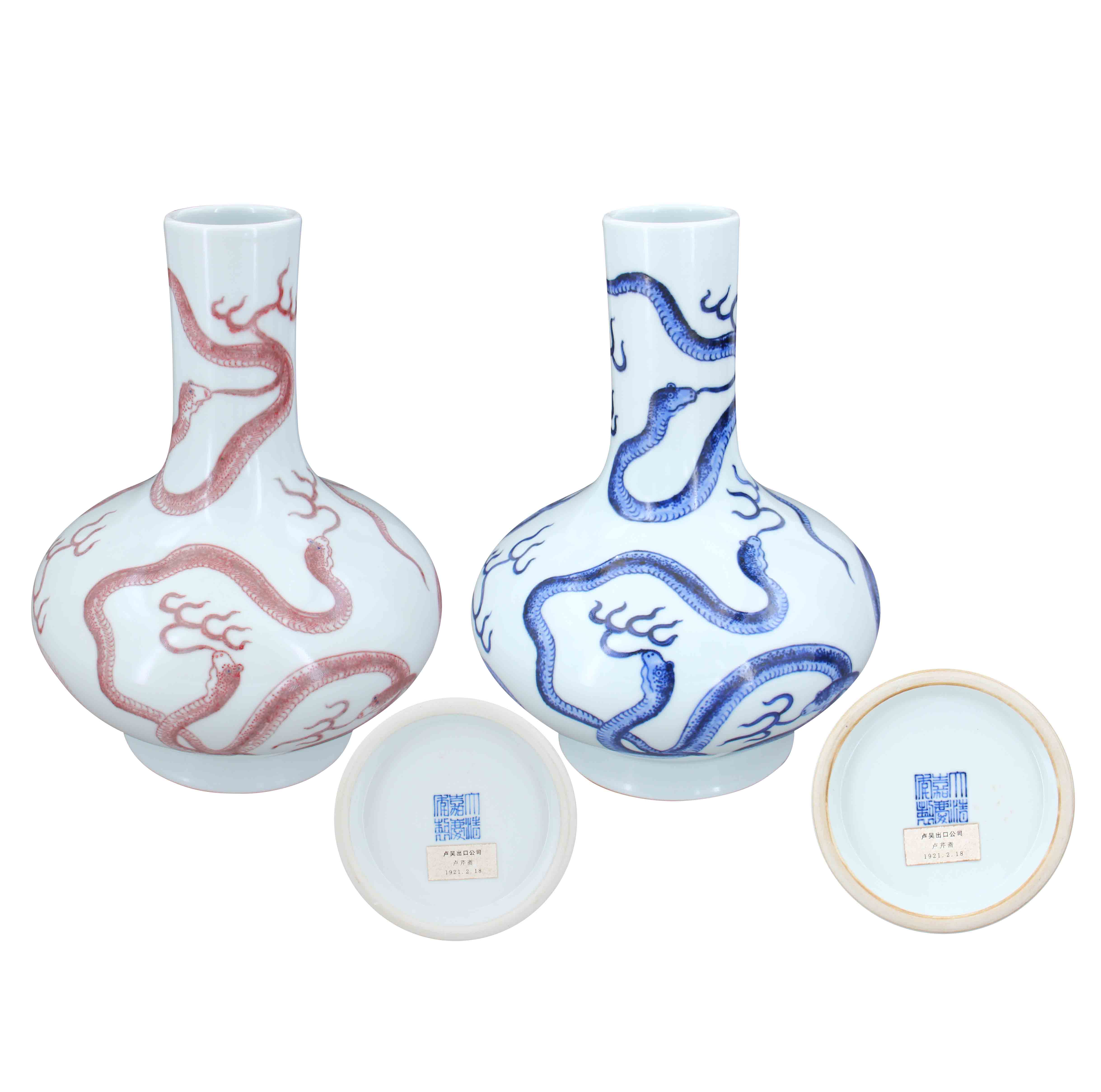 其次,紋飾是此件青花龍紋天球瓶的一大亮點(diǎn),并且重點(diǎn)是青花龍紋與釉里紅龍紋為一對(duì),更是極為難得!瓶身其一只為青花為飾,另一只為釉里紅為飾。繪制了精美的龍紋圖案。龍作為中華民族的象征,自古以來(lái)便是瓷器裝飾的常見題材。此對(duì)瓶上所繪龍紋,神龍形態(tài)各異,氣勢(shì)磅礴,或騰云駕霧,或戲珠于波濤之間,展現(xiàn)出皇家氣派與威嚴(yán)。使整件作品更具立體感和層次感。