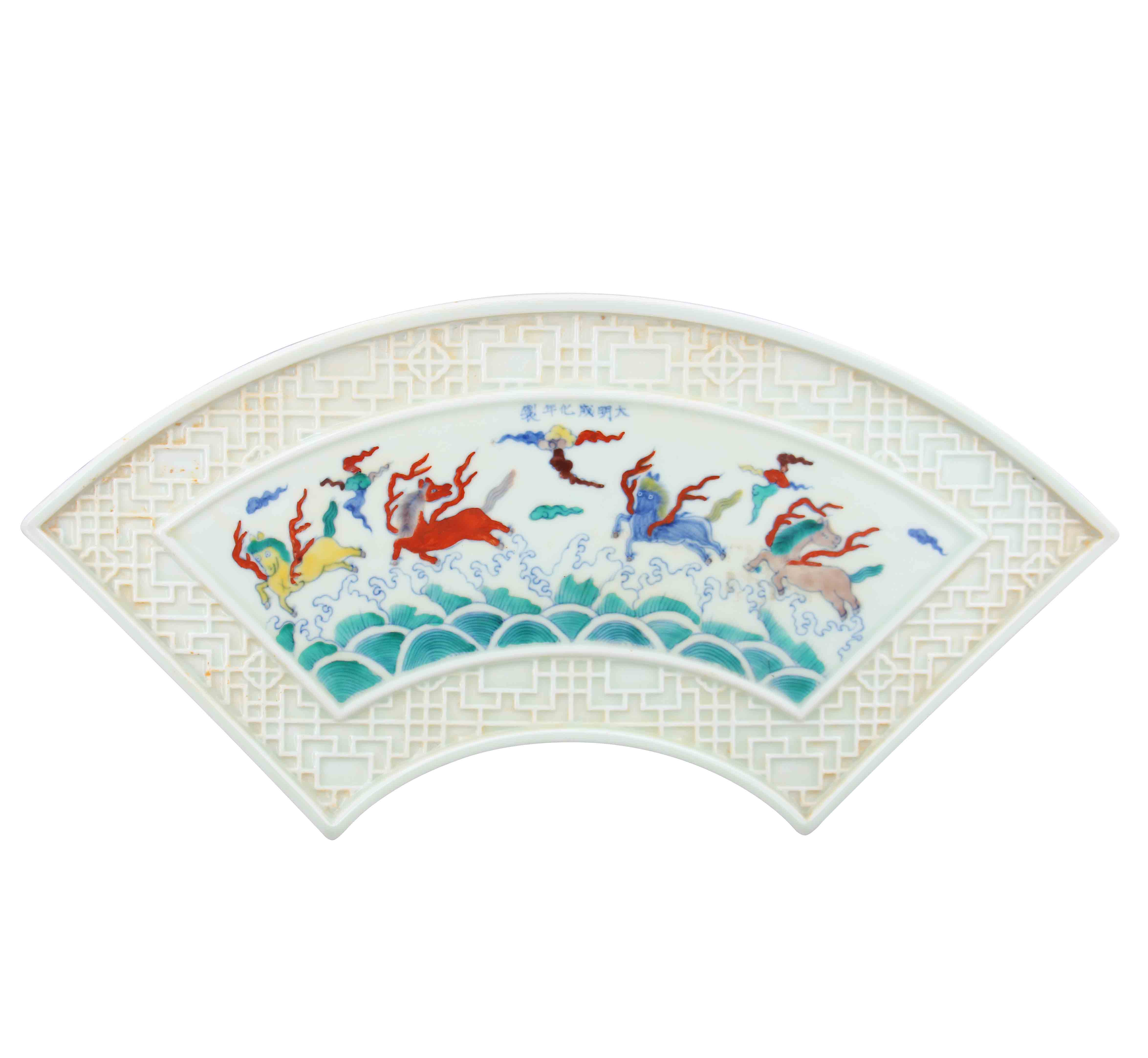 名稱:大明成化年制·斗彩海馬紋扇面瓷板