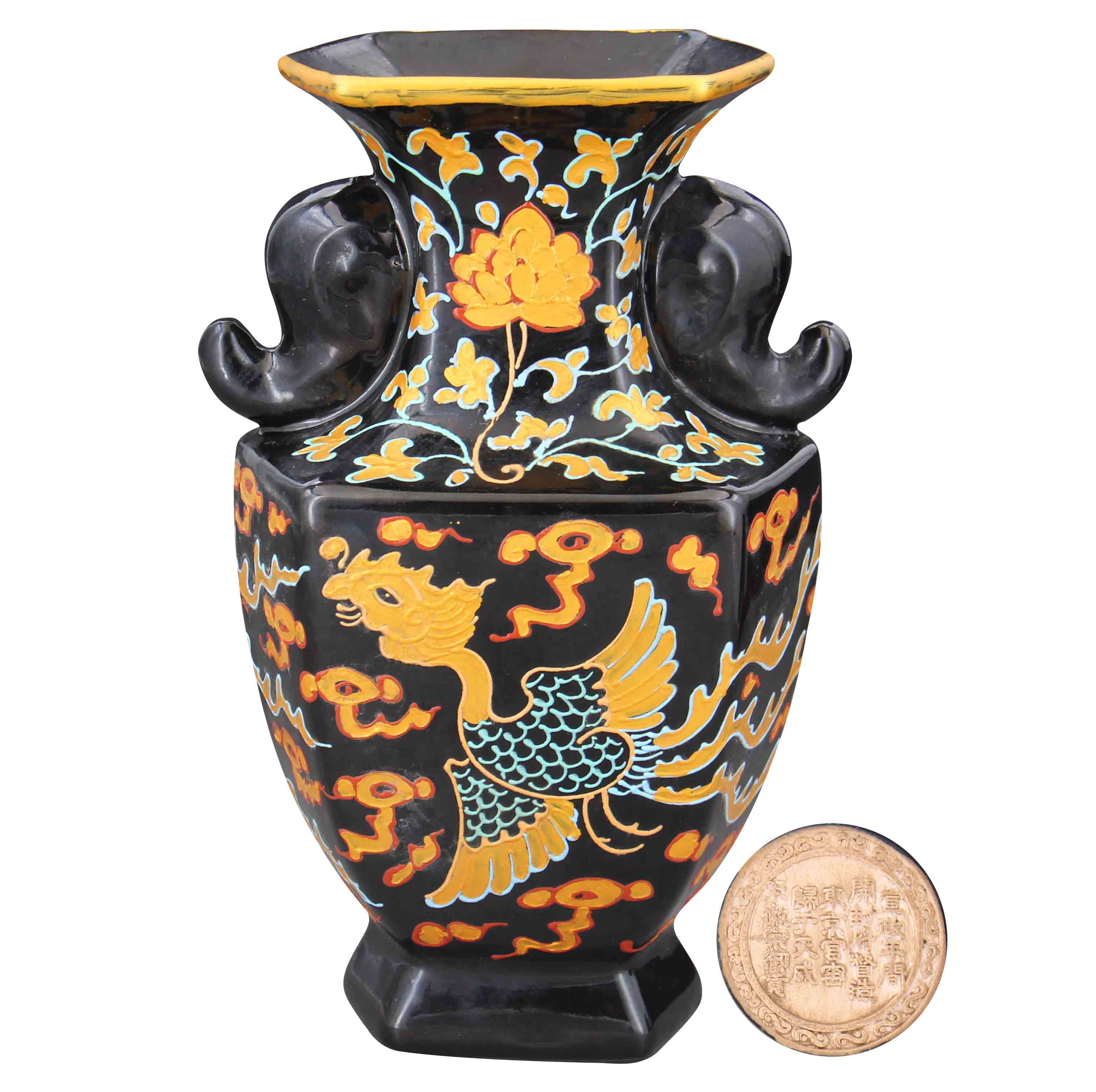 名稱:官窯·黑釉描金鳳紋雙象鼻六方瓶