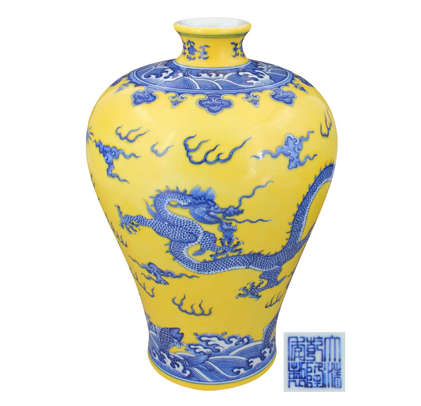 名稱:大清乾隆年制·黃地青花海水魚躍龍門梅瓶