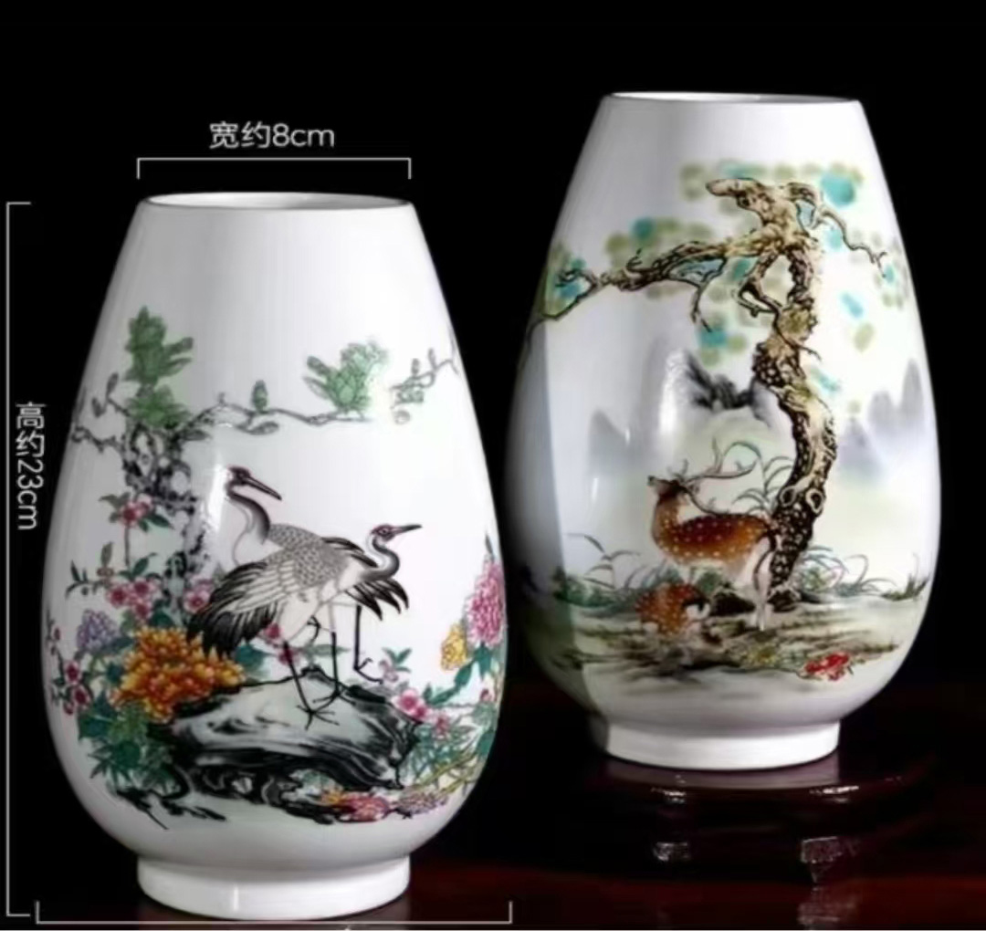 仙鶴象征長(zhǎng)壽、吉祥,麋鹿寓意福祿,二者與花草、松石相融,將東方美學(xué)中對(duì)祥瑞的追求,凝于瓷面,展現(xiàn)傳統(tǒng)繪畫(huà)藝術(shù)的精妙,是匠人心血與審美情趣的結(jié)晶,供人賞鑒間,感受古典藝術(shù)韻味。