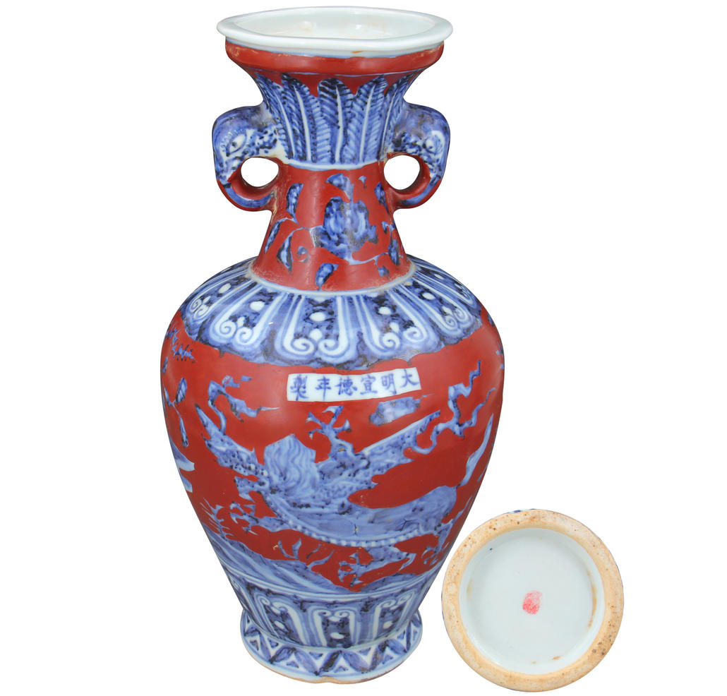 名稱:大明宣德年制·青花釉里紅雙象耳盤口瓶