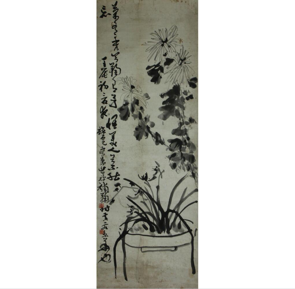 此幅作者為李苦禪(1899年1月11日—1983年6月11日),原名英杰,改名英,字超三、勵(lì)公,山東高唐人,現(xiàn)代書畫家、美術(shù)教育家,中國(guó)近現(xiàn)代大寫意花鳥畫宗師。和許麟廬(1916年10月19日—2011年8月9日),又名德麟,山東煙臺(tái)蓬萊人,當(dāng)代國(guó)畫家、書法家、書畫鑒賞家。曾任中國(guó)美術(shù)家協(xié)會(huì)和中國(guó)書法家協(xié)會(huì)會(huì)員、中山書畫社副社長(zhǎng)、中國(guó)老年書畫研究會(huì)副會(huì)長(zhǎng)、北京花鳥畫研究會(huì)會(huì)長(zhǎng)、北京中國(guó)畫研究會(huì)副會(huì)長(zhǎng)、北京中國(guó)書畫社名譽(yù)社長(zhǎng)等。此幅作品為兩位老師珠聯(lián)璧合之作。從文字體現(xiàn)為“蘭有秀兮菊有芳,惟美人兮不能忘。壬辰年初夏夜麟廬寫蘭苦禪補(bǔ)菊時(shí)共客京華也”從題跋處我們可以得出,這是于1952年時(shí)年53歲的李苦禪和36歲的許麟廬的聯(lián)袂之作!包括下面的兩枚印章也是韻散感非常充沛。再看線條的勾勒以及下筆都是較為有神韻。紙張的裝裱痕跡,我們認(rèn)為是完全到代并且充分表達(dá)了李苦禪與許麟廬的友誼致敬!在中國(guó)現(xiàn)代美術(shù)史上,齊白石與李苦禪、許麟廬三位國(guó)畫大師聲名赫赫,他們?nèi)丝缭浇雮(gè)世紀(jì)的師徒情誼,至今令人神往,成為中國(guó)近代畫壇的一段佳話,也是中國(guó)傳統(tǒng)藝術(shù)師承的典范。(重點(diǎn)為此幅作品為李苦禪、許麟廬珠聯(lián)璧合之作,也是精神層面與友誼層面的深切溝通。收藏價(jià)值不予言表!更是“精、真、稀”的準(zhǔn)確體現(xiàn)。)