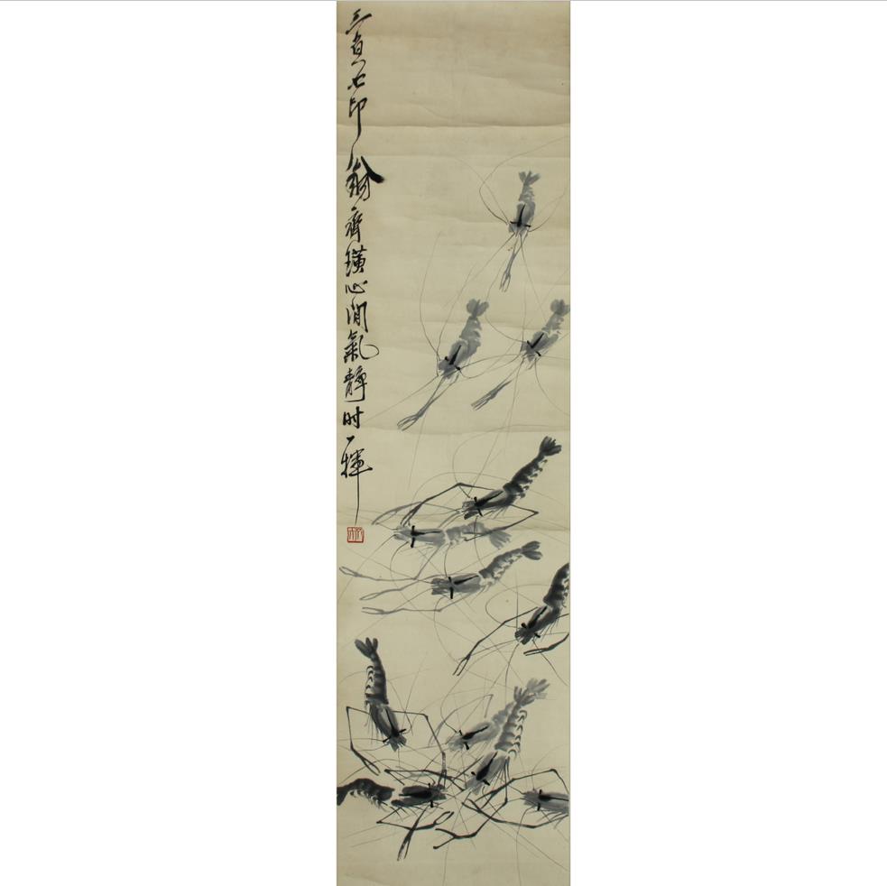 《群蝦圖》是近現(xiàn)代中國繪畫大師齊白石的代表作品。作品中的蝦在水里活潑 、靈敏、機(jī)警的游動著,很有生命力,蝦的觸須密密麻麻重疊在一起 形象逼真 躍然紙上。畫家寥寥數(shù)筆,用墨色的深淺濃淡以及用筆的出神入化,表現(xiàn)出一種 動感,栩栩如生,情趣盎然。蝦的腰部姿態(tài)各異,蝦須和長臂鉗則以富有金石味 的筆法描繪,使墨色結(jié)構(gòu)里蘊(yùn)含著豐富的意味和高妙技巧。整幅畫面可謂剛?cè)岵?濟(jì),洗練傳神,顯示了畫家高超的運(yùn)筆功力和對生活的體察入微。具有較高的收 藏價(jià)值!