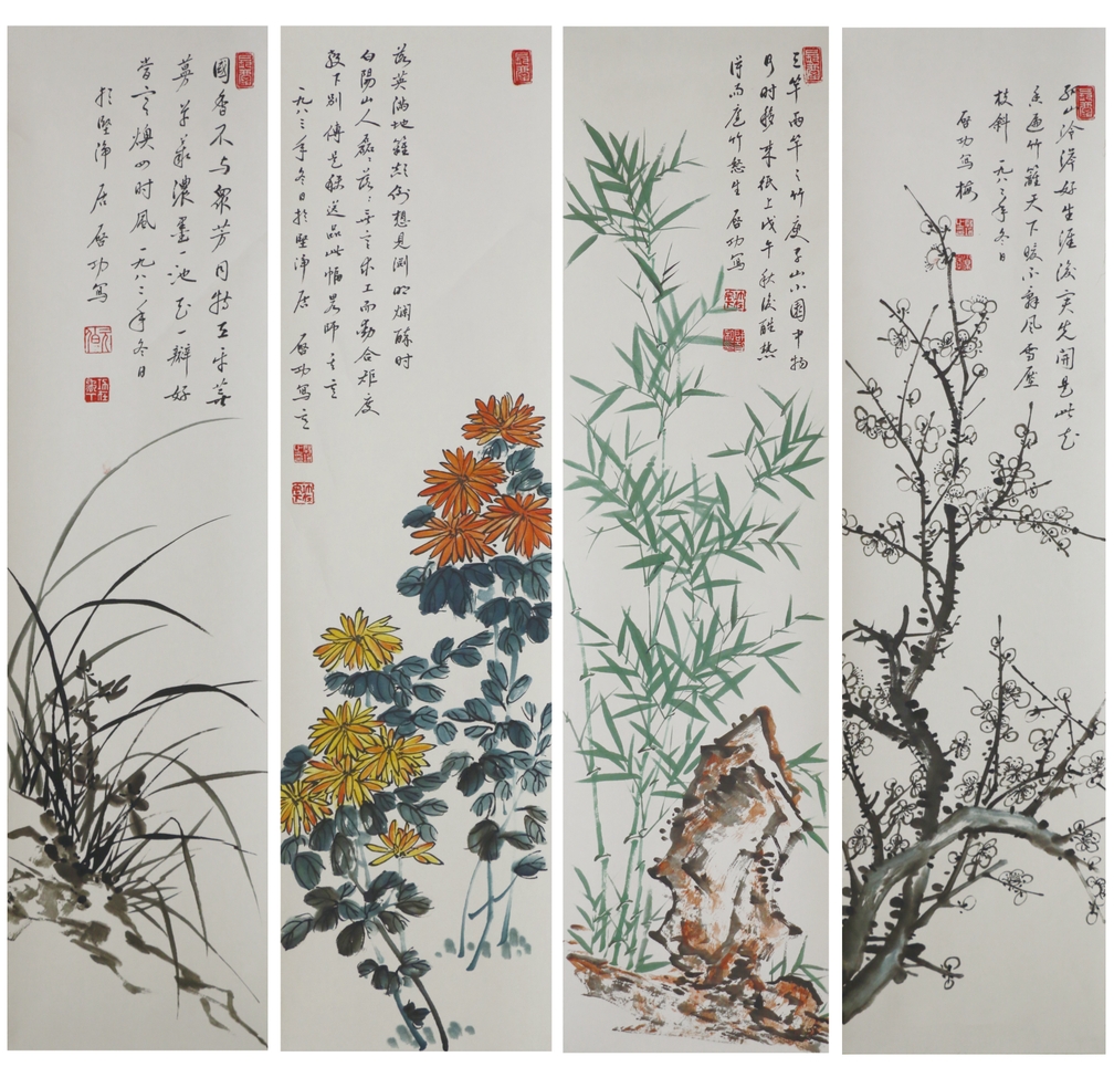 古往今來,人們都會把品格高尚的人稱為“君子”。而梅花、蘭花、竹子和菊花,自古以來一直被合稱為“花中四君子”,此副啟功筆下的“梅蘭竹菊”四條屏體現(xiàn)的正像人世間的君子一樣,正直、無畏、謙遜、文雅,用自身的精神感染著他人。具有較高的藝術價值和經(jīng)濟價值!