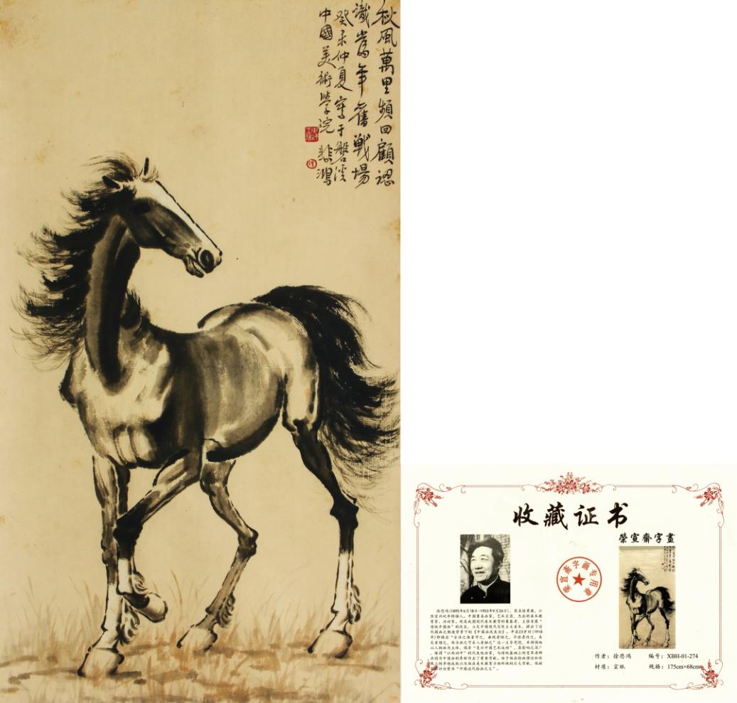 徐悲鴻款 〈玉駿圖〉徐悲鴻是近代史上一位有多方面成就的文藝大家教育家,我國藝術(shù)巨匠,是藝術(shù)界舉足輕重的人物,畫馬是一生中鐘愛描繪的題材,玉駿圖是一副充滿活力和激情的的作品,他以精湛的畫技和獨(dú)特的藝術(shù)風(fēng)格,描繪了一匹駿馬昂首挺胸、四踢飛騰的英姿,運(yùn)用了粗筆勾勒的方式,將馬的輪廓表現(xiàn)的淋漓盡致,細(xì)節(jié)的處理通過淡墨的變化,呈現(xiàn)光影明暗的效果,不僅增強(qiáng)了畫面的立體感,也使駿馬更加栩栩如生!整體來看玉駿圖簡潔高雅、結(jié)構(gòu)精準(zhǔn)、筆墨濃淡相適,這種獨(dú)特的藝術(shù)風(fēng)格和精湛的畫技成為畫馬作品的代表之一,極具有一定的收藏價(jià)值……