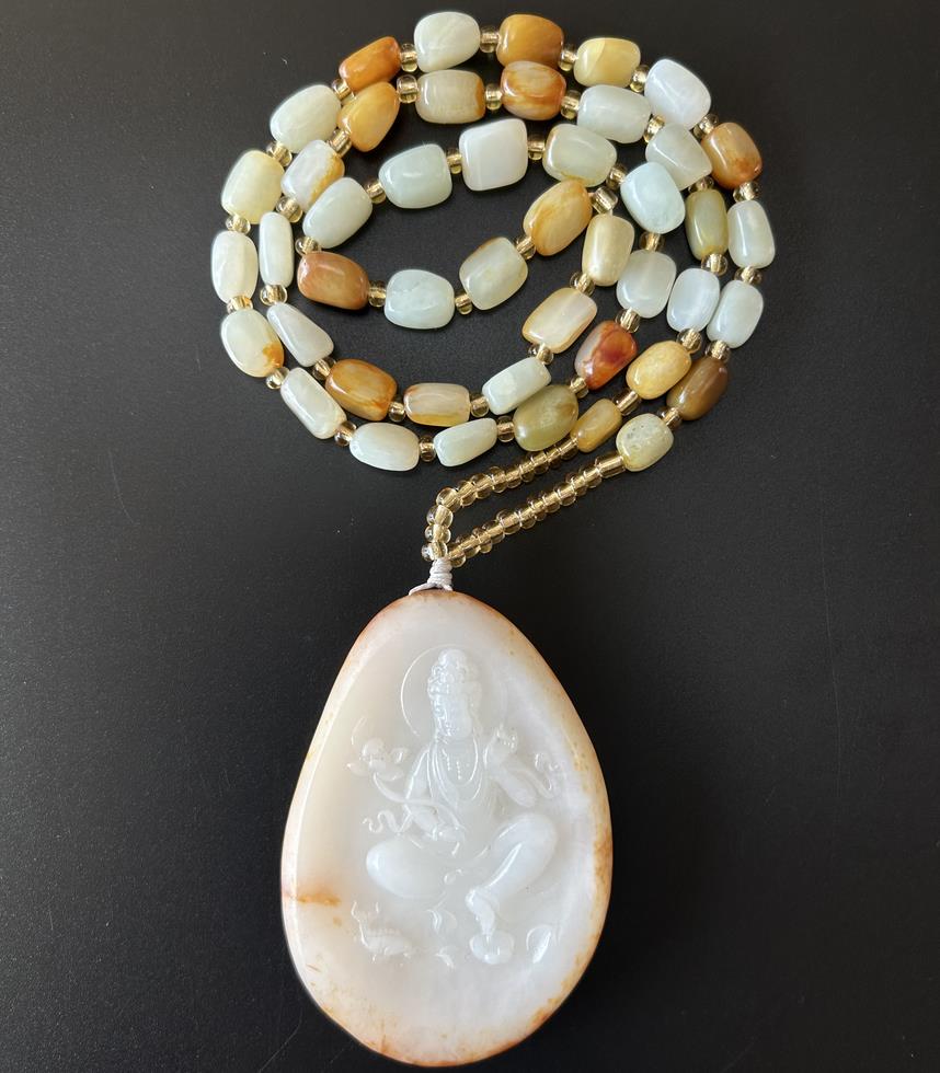 此件作為我國(guó)四大名玉之首的新疆和田玉。從整體的色澤以及油潤(rùn)度來(lái)講,是較為典型的“一級(jí)白”籽料。題材為“普度眾生”掛件。玉質(zhì)溫潤(rùn)細(xì)膩,油潤(rùn)度飽滿。并且此掛件背面以及項(xiàng)鏈位置都是有明顯的石皮原色。整體雕工采用“陽(yáng)雕以及陰雕”手法。觀音神似端莊肅穆,大慈大悲之相,普度眾生之態(tài)表現(xiàn)的淋漓盡致。寓意觀音庇佑,灑福人間,風(fēng)調(diào)雨順,保天下太平。ㄙ|(zhì)量80.60g,鏈長(zhǎng)約30cm。并附有中疆珠寶玉石鑒定中心鑒定證書和宋少軍大師的雕刻證書)