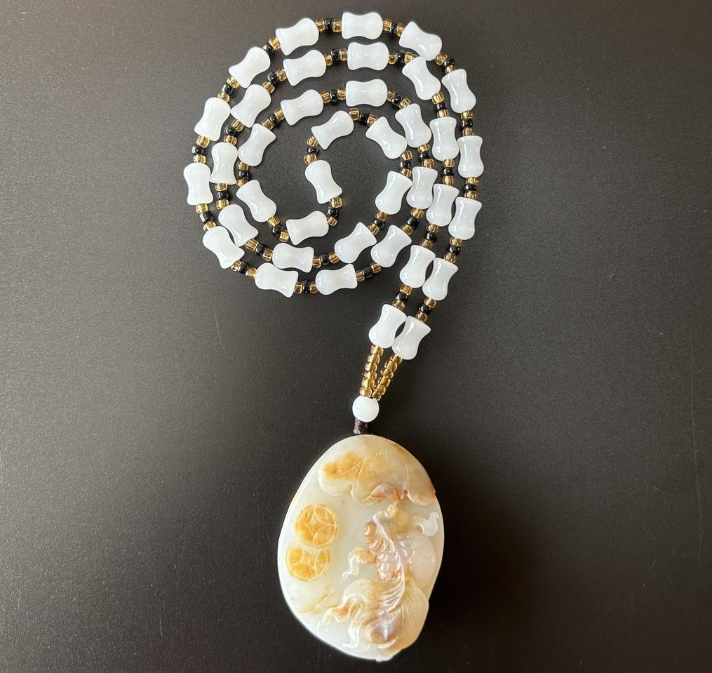 此件作為我國四大名玉之首的新疆和田玉。從整體的色澤以及油潤度來講,是較為典型的“一級(jí)白”籽料。題材為“金玉滿堂連年有余掛件”。玉質(zhì)極為細(xì)膩,油潤度飽滿。重點(diǎn)此雕工重點(diǎn)利用較為難以掌握的技法“俏雕”工藝技法。并且也存在“陽雕、陰雕”技法。以荷葉與魚、古錢相結(jié)合,取材于自然。 雖然簡(jiǎn)單,但意義深刻。彰顯有荷花、古錢、魚紋寓意百年契合、仕途順利、年年有余等。(質(zhì)量67g,鏈長約32cm。)