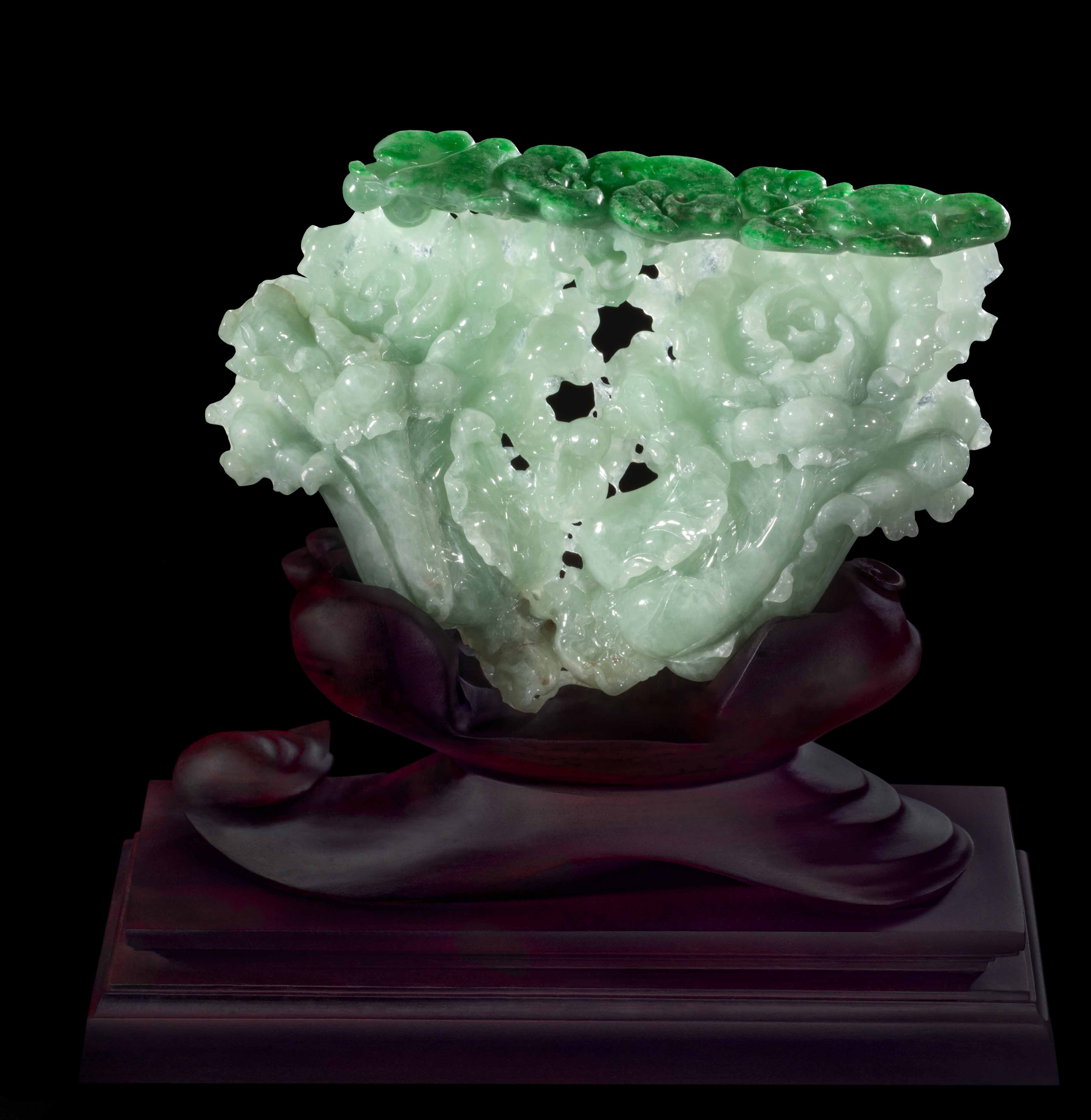 此翡翠白菜絕世臻品。縱觀這對(duì)木座翡翠白菜藝術(shù)珍品,底部是長(zhǎng)方形精雕木座,頂部則是一對(duì)雕工精美,品相奢華的翡翠白菜。綠白相間的天然色澤,就像出水芙蓉一般,清澈欲滴。淡淡的紫羅蘭相間,翡葉精雕細(xì)琢,似葉似云。白菜葉上的金蟾匍匐,古語云“家有金蟾,錢財(cái)綿綿”。 古寓:福。祿。壽俱全,是一件不可多得藝術(shù)珍品!