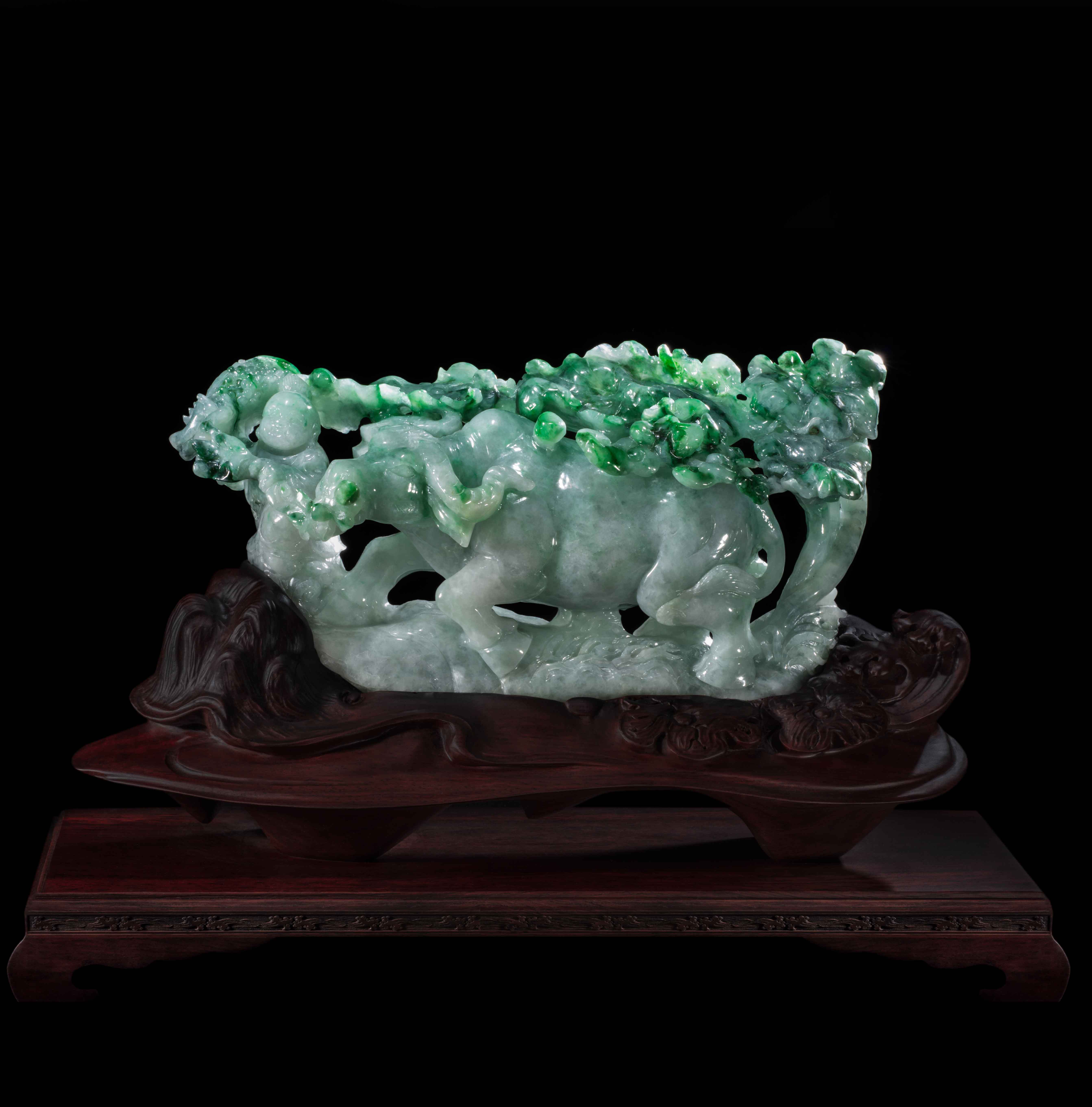 材質(zhì)、雕工等方面,是典型的老坑種翡翠,種水色三方面較為飽滿,特別是整體玉牛的線條感以及肌腱張弛有力,重點(diǎn)是采用圓雕以及俏雕技法使得整體藝術(shù)風(fēng)格極為飽滿。匠人將牛的形象雕刻得肥壯健碩,前方有孩童牽引、牛身頂于滕樹(shù)之下,腳下綠樹(shù)成蔭,象征福澤連連、財(cái)源滾滾。輪廓及五官勾勒有致,生動(dòng)而富有靈氣,線條流暢,層次分明,展現(xiàn)出精湛的雕工和藝術(shù)價(jià)值!