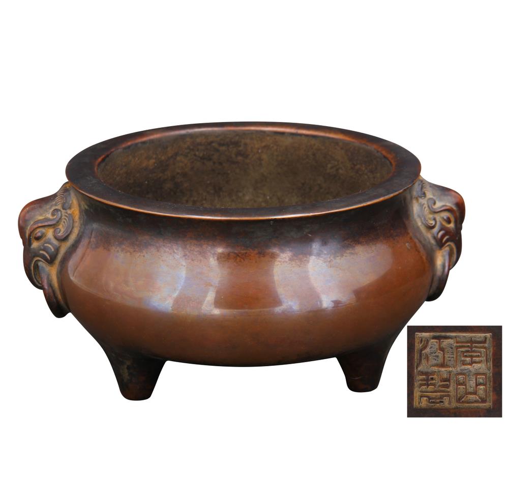 象乃瑞獸,與“祥”諧音,故被賦予了吉祥太平的寓意。象鼻能吸水招財(cái),鼻 卷又似如意,寓意為招財(cái)納福吉祥如意。象是象征太平的神獸,俗話:太平有象 、如意吉祥、萬象更新、安家樂業(yè)。此爐寶光四現(xiàn),鑄工精細(xì),質(zhì)量平均,造型 古樸渾雅,其內(nèi)腔亦有欣賞和斷代價值,反映了匠心和時代的審美情趣。是我國 清代銅器鑄造的巔峰之作。