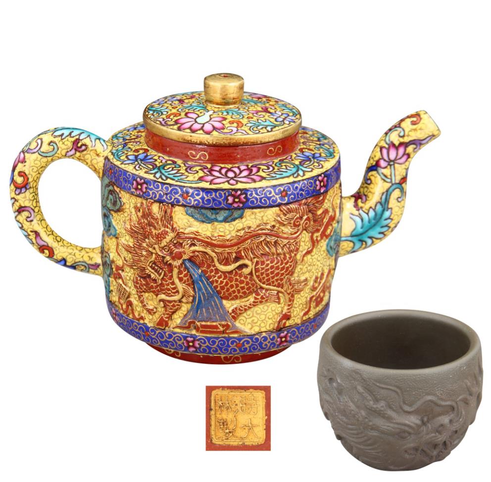 名稱:時大彬款·紫砂加彩描金把壺