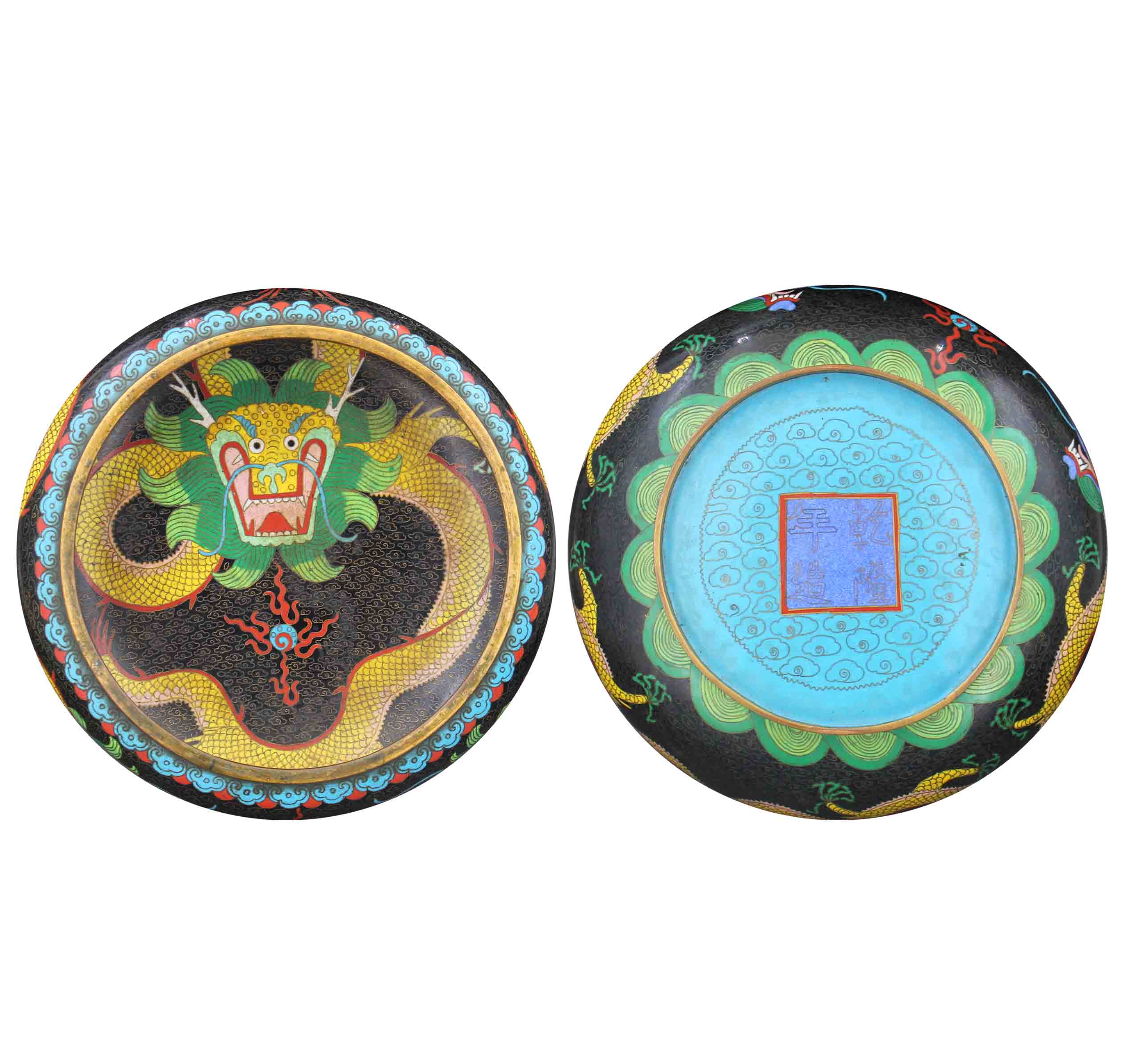 紋飾設(shè)計尤見匠心,正反兩面皆以傳統(tǒng)吉祥題材為核心,卻各具巧思。正面主體飾以五爪巨龍,龍首高昂,雙目圓睜,龍須飄逸,利齒微張,盡顯威嚴氣勢;龍身纏繞盤曲,鱗片層疊分明,環(huán)繞寶珠,口吐烈焰,營造出騰云駕霧的動態(tài)感。龍身以明黃為主色調(diào),間施翠綠、正紅、寶藍等琺瑯彩,釉色飽滿瑩潤,歷經(jīng)歲月仍熠熠生輝,局部因使用痕跡形成的自然包漿,更添古樸韻味?谘赝獠克闹芊淼脑萍y與鋸齒狀火焰紋規(guī)整,底部則以天藍色為地,外圍環(huán)飾纏枝蓮紋與如意云頭紋,與正面濃麗風(fēng)格形成虛實對比,既彰顯皇家禮制的莊重,又融入文人審美意趣。